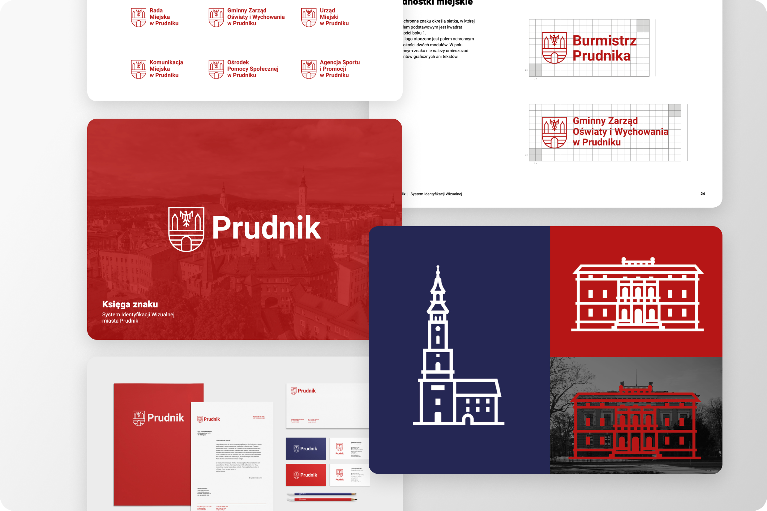 Powstał kompletny System Identyfikacji Wizualnej, który nadał miastu ustandaryzowany, profesjonalny i spójny charakter. Opracowałam logo w kilku wariantach — poziomym, pionowym, samym znaku (sygnetem) oraz zestaw logotypów dla spółek miejskich. Dopełnieniem projektu jest rozbudowana księga znaku, seria ikon przedstawiających charakterystyczne miejsca w Prudniku oraz zestaw materiałów poligraficznych dla jednostek miejskich. Wdrożenie SIW uporządkowało komunikację na linii urząd–mieszkaniec, a miastu nadało nowoczesny, estetyczny i ponadczasowy wizerunek. Spójny system ograniczył chaos wizualny, uporządkował przestrzeń publiczną i wzmocnił markę miasta, podkreślając jego kulturową i historyczną tożsamość.